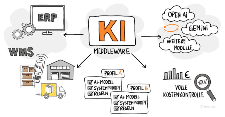 Mit unserem KI-Proxy und unserer KI-API stellen wir eine zentrale Schnittstelle für die Integration von künstlicher Intelligenz in Warenwirtschafts-, ERP- und andere Unternehmenssysteme bereit. Unsere KI-Middleware verbindet Anwendungen, Daten und KI-Modelle über eine einheitliche API und ermöglicht so eine strukturierte und effiziente Anbindung von KI-Funktionen an bestehende Software.